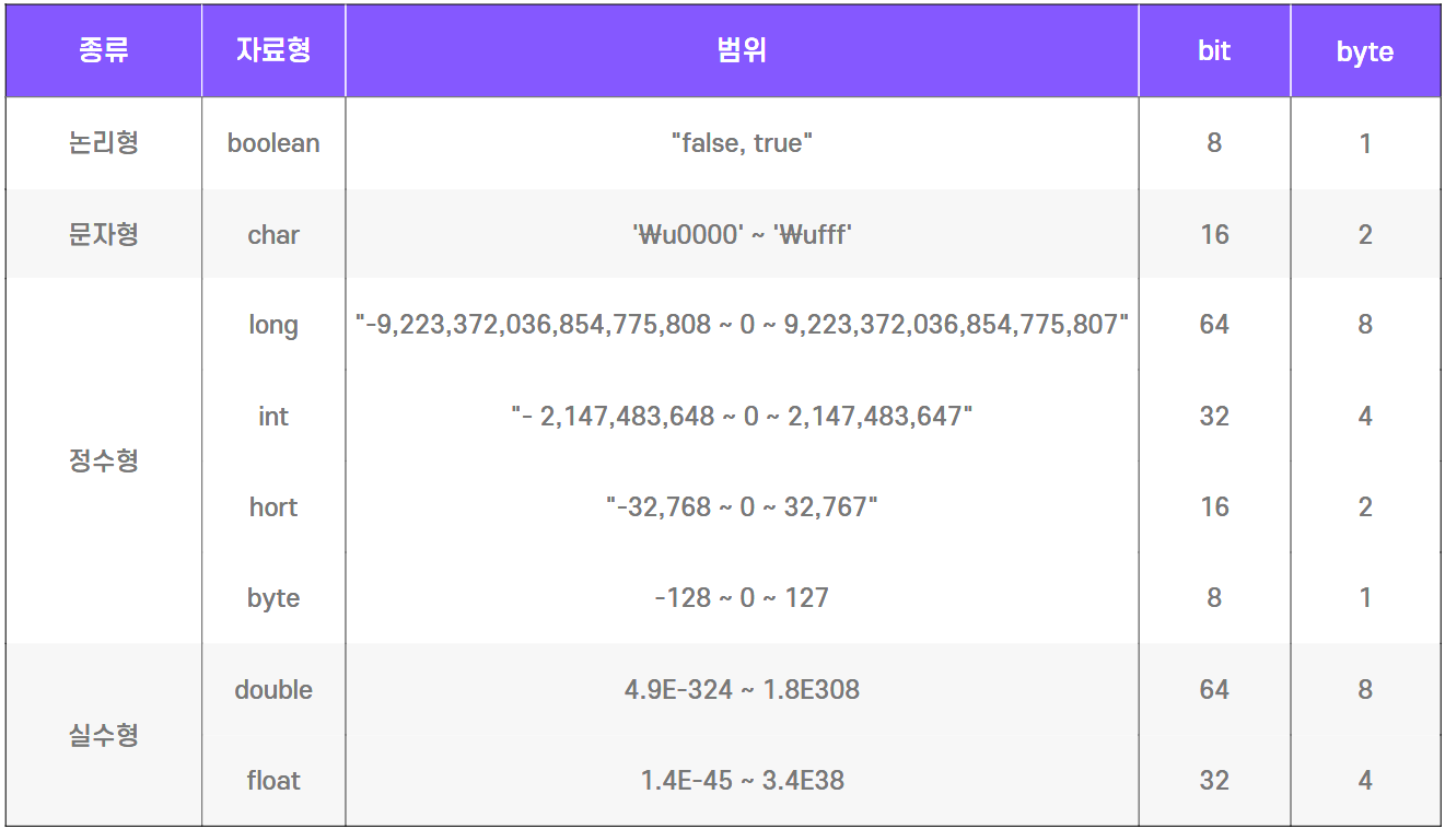 - 논리형 : boolean을 제외한 나머지 7개의 기본형은 서로 연산이 가능합니다. 자바는 최소 단위가 1byte이므로, 1byte로 구성되어있습니다.(